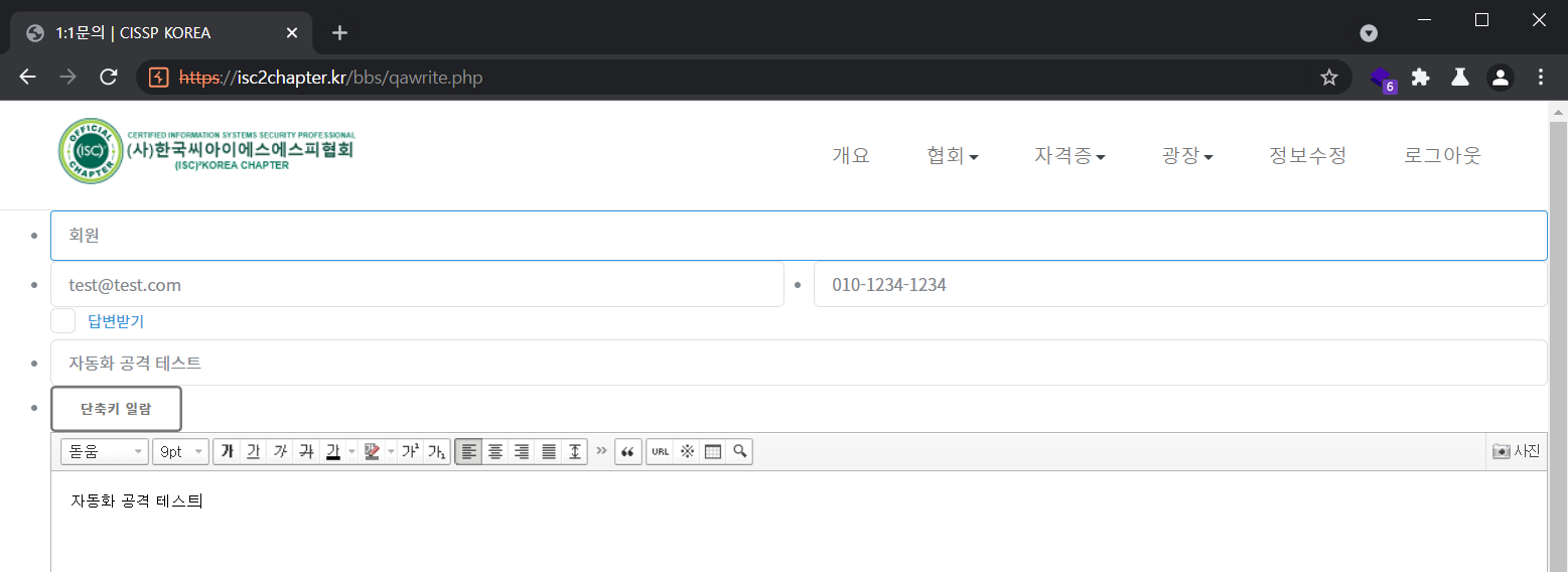 https://isc2chapter.kr/bbs/qalist.php를 통해 웹 페이지 내 공개되지 않은 ‘문의하기’ 게시판에 접근이 가능하며, 임의의 문의 등록을 시도함